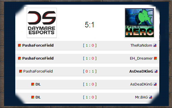 Прошёл КВ с Даймар 1 Вышел Рандом на этот раз ему не удалось сделать задел, 2 наш зерг почти убил ГМЛа. Кинг в очередной раз Хорошо сыграл пвп, но проиграл зергу,Баг был не совсем в форме и тоже проиграл зергу Не получился у нас реванш но счёт не 0-4 будем развиваться дальше ,есть куда расти