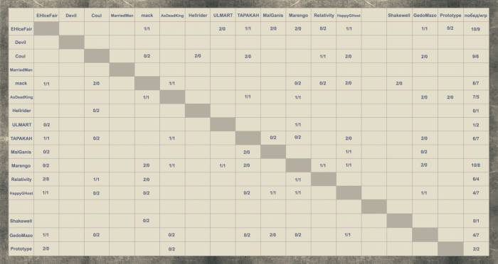 Напоминаю, БО2, все со всеми. Первую карту черкаем, дальше лузерпик. Первым черкает тот, кто находится ниже в таблице. Первые вычеркнутые карты не выбираются, карты не повторяются.