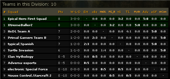 Обновилась таблица лиги SC2CL, мы, вместе с командой XtremeBallerZ занимаем первое место в группе! Судя по всему на этой неделе и на следующей у нас будет формальный КВ с командами: electronic Special (4.11.2012 в 22.00) Clan Mythology (11.11.2012 в 22.00) Так как эти команды еще не сыграли не одной игры. Самое главное подать как обычно лайнап.