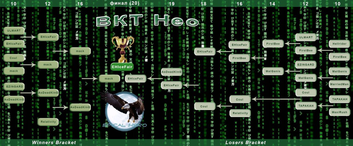 Вот и дошли мы до второго этапа ^_^. Цифры сверху - даты до которых нужно сыграть определенный этап. Если в 21:30 МСК противник не появляется, ему присуждается техлуз (его могут выписать я, MalGanis, EHIceFair или TAPAKAH, но конечно не в своем сете:)). При обоюдном желании можно сыграть позже в этот день. Дата - крайняя, то есть можно сыграть хоть 3 игры в один день и тогда будет запас времени. Финал проводиться 20 июля в 21:00 МСК (если кому-то из финалистов крайне не удобно, будем переносить). Все игры БО3, финал БО5. Маппул ладерный, первая карта определена согласно цифре сверху 10 - Облачное Королевство 12 - Охана 14 - Рассвет 16 - Антигарськая Верфь 18 - Гряда Обреченных 19 - Сокрытая Долина 20 - Плато Шакураса Последующие карты выбираются лузерпиком