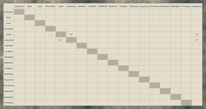 Итак, БО2, все со всеми. Первую карту черкаем, дальше лузерпик. Первым черкает тот, кто находится ниже в таблице. Первые вычеркнутые карты не выбираются, карты не повторяются.
