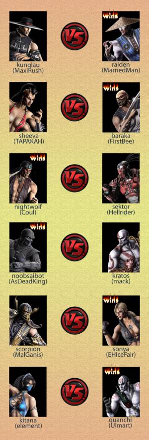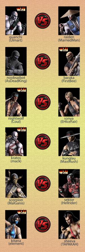 все играют еще по одному бою (оказалось что двоих маловато :D) вот сейчас у 4-х человек 2+ побед Hellrider сыграет c AsDeadKing и будет 5 человек остаются игры MarriedMan vs Ulmart MarriedMan vs FirstBee